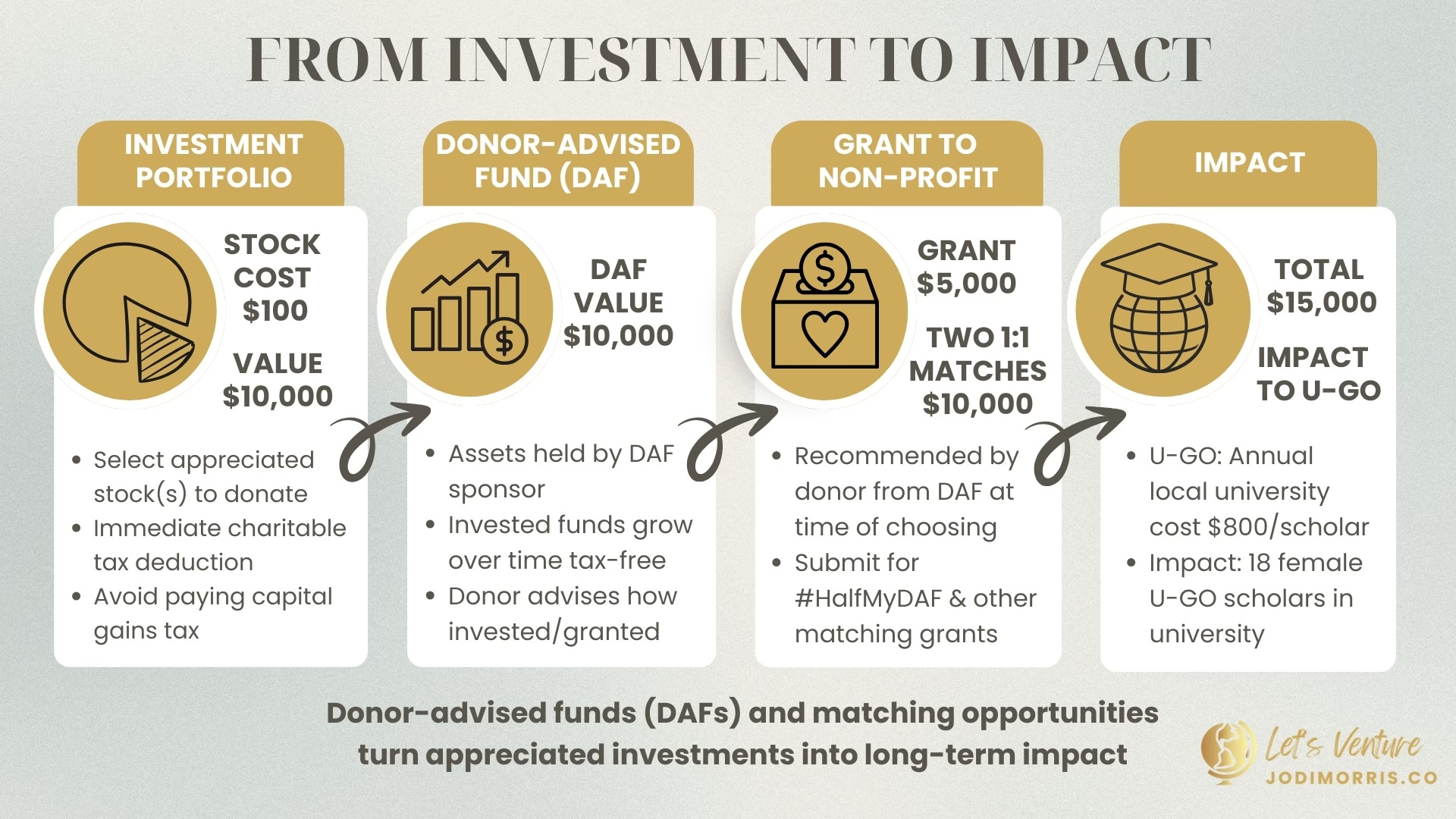 But I don’t have to sell share. I can gift them—and earn an immediate tax deduction and avoid paying capital gains tax. And the winnings go towards my charitable strategy to fund girls’ education.