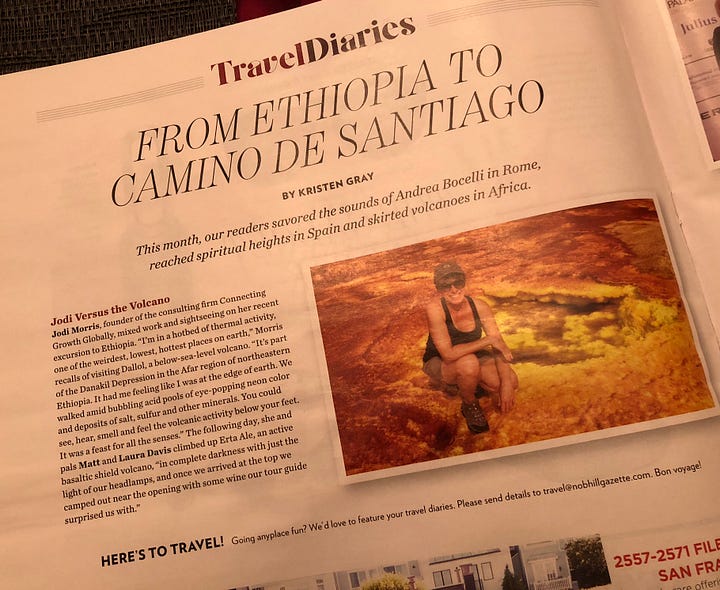 A year later, I’m the front passenger in a car driven by Laura Davis through the streets of Addis Ababa, Ethiopia. My husband and two American friends are in the backseat.